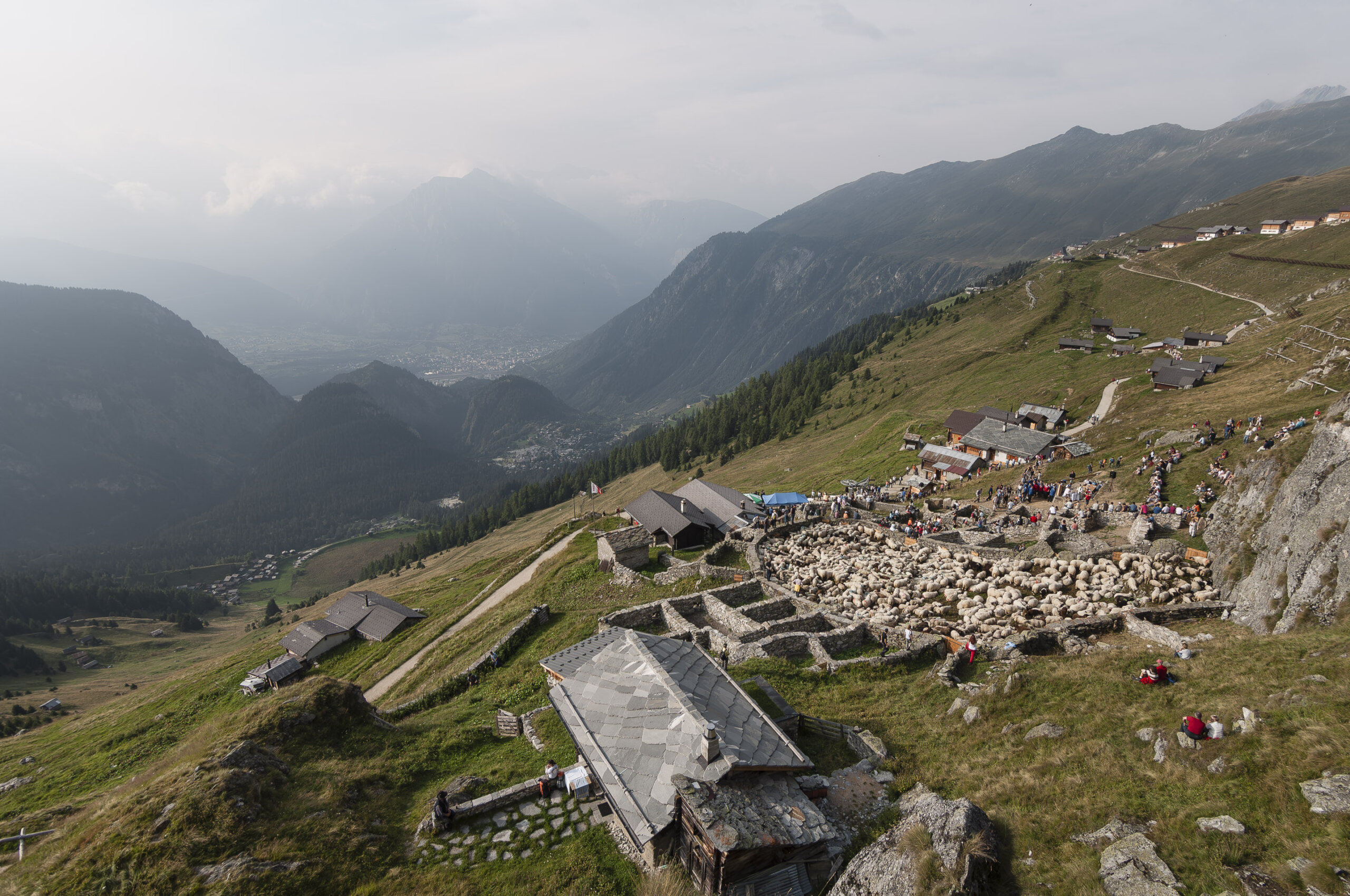 Every year in autumn, a dozen hobby shepherds ascend the steep mountainsides west of the Great Aletsch Glacier to gather the roughly thousand sheep that have grazed freely and unattended there all summer. The sheep climb to heights of up to 3000 meters above sea level. After two days of hard and perilous work, the men lead the animals down to Belalp, where the wool caravan is welcomed with a shepherd's festival. The highlight of the Belalp "Schäful" is the traditional sheep separation on the fourth day: in the old stone pen, the animals are distributed among their owners – a rodeo in the Valaisan style. © Michael Ganz